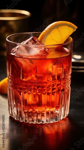 Classic negroni cocktail with orange garnish in crystal glass Vermouth Day