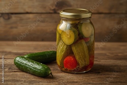 Classic pickled cucumbers and peppers displayed on a rustic wooden surface