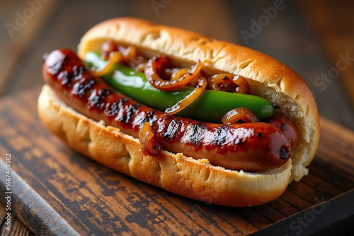 sausage, hot, dog, epicure, food, grill, grilled, delicious, meal, classic, bun, pepper, onion, rustic, wood, board, table, receipe, cooking, lunch, dinner, snack, street, american, cookery, savoury, tasty, juicy, fresh, bar-b-q, picnic, comfort, sauce, topping, serving, professional, photo, high-quality, plate, deliciously, eatery, menu, foodstuff
