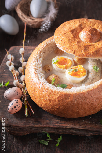soup, sour, easter, bread, homemade, polish, egg, loaf, springtime, cookery, food, meal, traditional, holiday, lunch, easter egg, sausage, dinner, meat, dish, cooking, epicure, delicious, christmas, vegetable, fermented, poland, potato, rustic, marjoram, feather, healthy, quail egg, rural