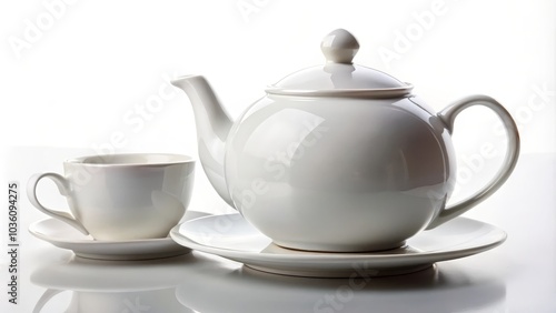 teapot, teacup, tea, white, table, reflecting, surface, ceramic, porcelain, beverage, drink, hot, breakfast, morning, kitchen, tableware, saucer, elegant, luxury, design, set, nobody, indoor, studio, still, life, closeup, copy, space