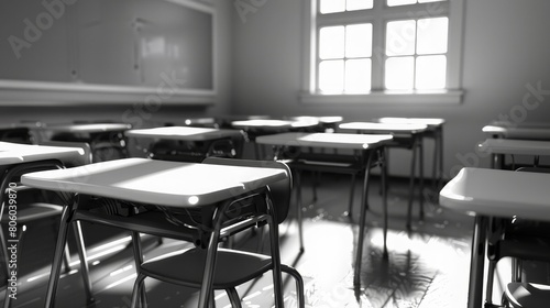 Classroom, school. Places for students, desks, blackboard. Wooden desks. Large windows, good lighting. Black and white