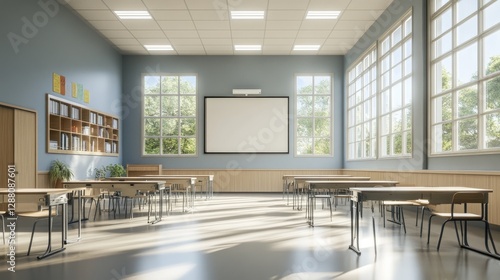Clean and modern high school classroom with neutral color palette, projector screen, and futuristic desks, D render