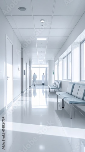 Clean Hospital Interior with White Walls, Benches, and Distant Medical Staff for Healthcare Concepts
