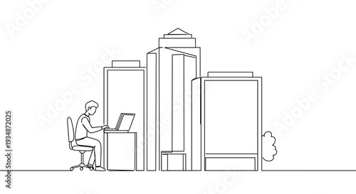 Clean line vector of a person working at a desk with a laptop, surrounded by tall buildings, on a transparent background