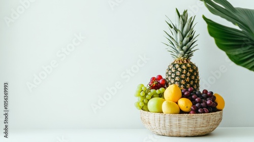 Clean white canvas displaying a fruit basket with a pineapple and a variety of fresh fruits, showcasing the vibrant colors and health benefits of plant-based food