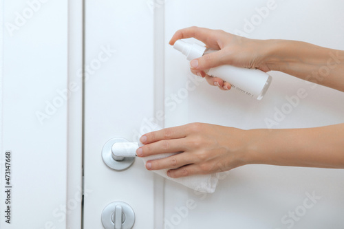 Cleaning black door handles with an antiseptic white wet wipe and sanitizer spray. Sanitize surfaces prevention in hospital and public spaces against corona virus. Woman hand using towel for cleaning