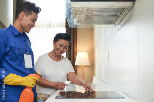 man, male, men at work, professional, handyman, service, domestic, asian, vietnamese, young, uniform, senior, showing, woman, client, smiling, employee, bucket, cleaning, detergent, housework, supply, spray, dirty, induction, cooker