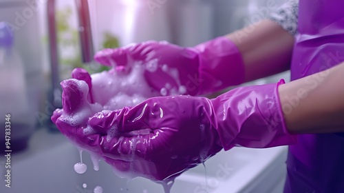 Cleansing the home using detergent filled purple gloves