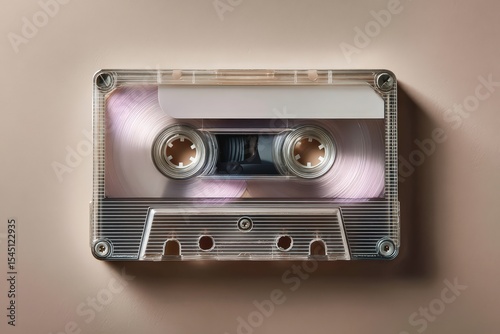 Clear audio cassette resting on a smooth surface showcasing its detailed texture and vintage design from the 1980s