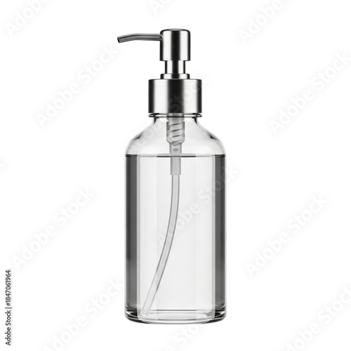 Clear glass bottle with silver pump dispenser isolated on transparent background
