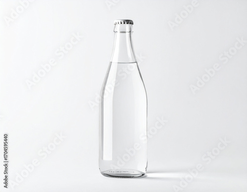 Clear Glass Bottle with Water on White Background, Minimalist Style