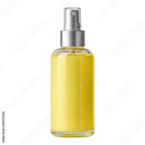Clear Glass Bottle with Yellow Liquid and Silver Spray Top
