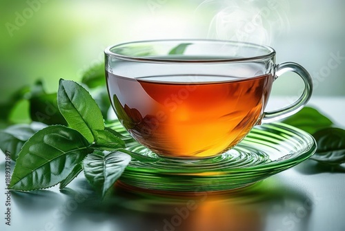 Clear glass cup filled with hot amber-colored tea on a green saucer surrounded by fresh green tea leaves with steam rising in soft natural light