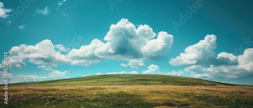 Clear sky with a few fluffy white clouds over a rolling green meadow, perfect for a peaceful and idyllic countryside scene, Photography, taken with a 35mm lens,