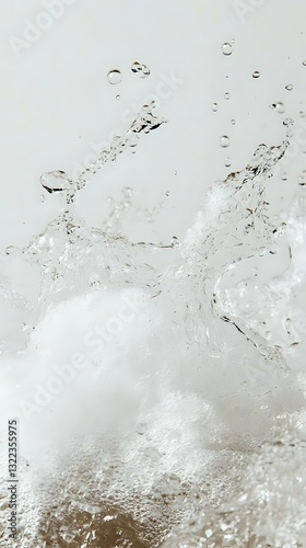 Clear water splash with rising bubbles and dynamic motion captured against light background, creating abstract patterns of liquid movement and droplets in macro photography.
