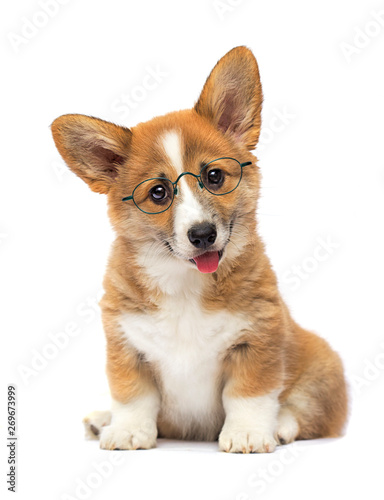clever puppy in glasses, welsh corgi breed