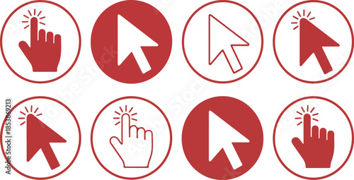 click, pointer, icon, set, red, white, circular, symbol, design, interface, cursor, buttons, vector, graphic, illustration, web, navigation, computer, arrow, digital, element, signs, flat, isolated, modern, collection, touch, cyberspace, application, round, background, shape, minimalist, visual, user, technology, interactive, online, site, software, menu, choice, press, finger, tool, link, push