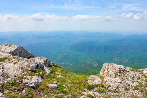 cliff of a mountain with stones, grass and flowers in the foreground, distant hills covered with forest and sky with clouds in the background in the Crimean mountains in Europe