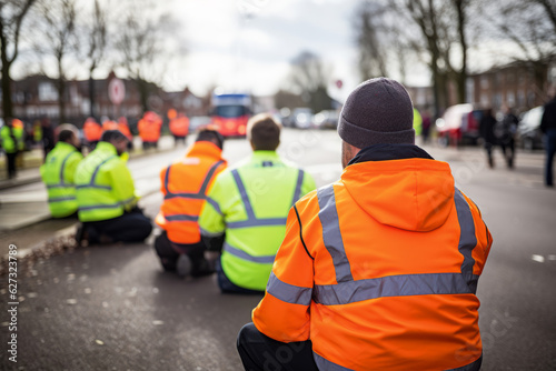 Climate change protest activists wearing hi vis jacket sit on a road and block traffic