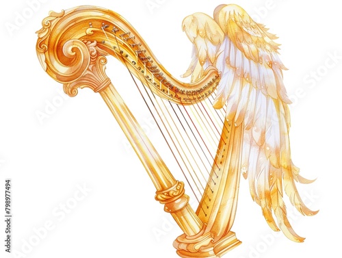 clip art, angel, harp, watercolor, gold, aethereal, isolate, white, heavenly, wing, dreamlike, radiant, artwork, symbol, blissful, virtuous, sacred, vision, lightness, airy, peaceful, splendid, gorgeous, enchant, dreamy