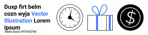 Clock icon indicating time, gift box with blue ribbon symbolizing holiday or special occasion gifts, and dollar coin suggesting financial matters thumbs up budgeting or investments. Ideal for time