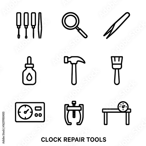 clock, repair, tool, icon, outline, icon, set, tool, screwdriver, magnifying, glasses, tweezer, oil, dropper, hammer, cleaning, brush, timing, machine, gear, puller, workbench, line, only, black, colours, consistent