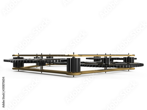 Clockwork mechanism with steel cogs and brass bridge on white background
