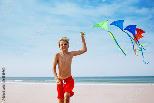 Close boy run on the beach holding a colorful kite group