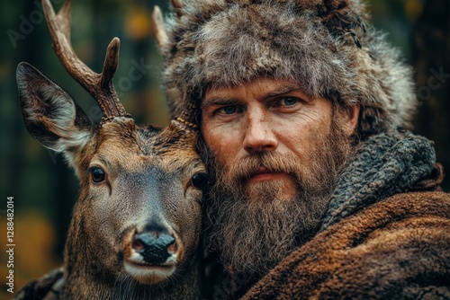 Close encounter between a bearded man in fur and a deer in a serene forest setting during autumn