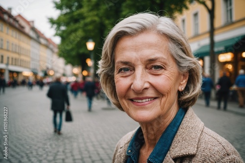 Close portrait of a smiling senior Austrian woman looking at the camera, Austrian city outdoors blurred background