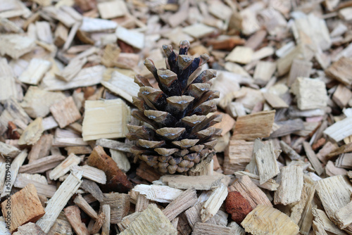 Close snapshot of a pine cone on a wopden sawdust