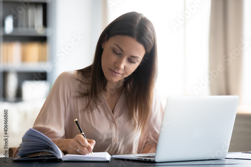 Close up confident young woman writing notes, sitting at work desk with laptop, serious female working or studying online at home, learning language, watching webinar, planning day in organizer