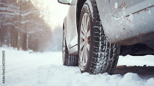 close up detail part of a car with tires in focus in a snowy winter landscape