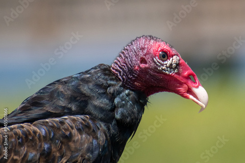 Close up detailed profile of a Turkey Vulture's face set against a blurred background.