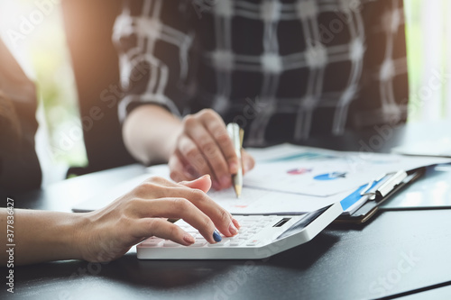 Close up hand woman doing finance and calculate on desk about cost at office.