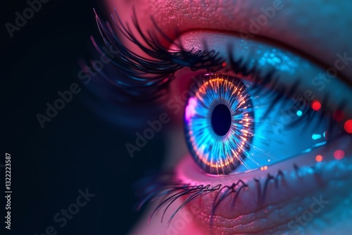 eye, iris, pupil, lash, neon, glowing, futuristic, digital, technology, blue, orange, red, closeup, detail, macro, illuminated, light, design, vision, cybernetic, human, beauty, science, fiction, abstract, colours, bright, lens, retina, look, sharpened, artificial, enhanced, perspective, aethereal, dark, skin, eyelid, surface, circuit, pattern, glow, line, circle, vibrant, connection