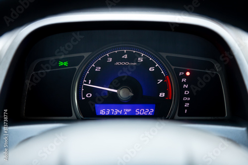Close up Instrument automobile panel with Odometer, speedometer, tachometer, fuel level.