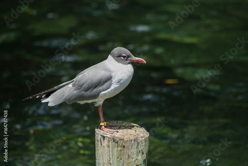 close up little grey bird standing still on wood log with green fresh water background at zoo