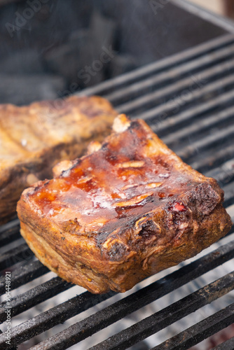 Close up marinated pork ribs are cooked on the coals of a barbecue