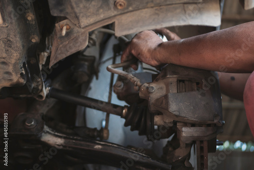 Close up Mechanic man hands repairing car auto repair shop uses jack change tyre. Man hands fixing Shock absorber machinery vehicle mechanical service. Vehicle Car overhaul maintenance engineer