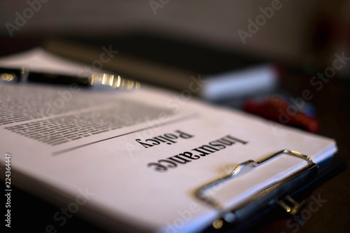 Close up object insurance car concept. insurance car with clip board, note book, pen and documents on working table.