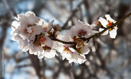 Close up of branch with beautiful almond flowers.