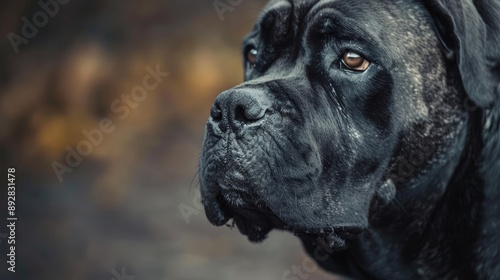 Close Up Of A Black Cane Corso Dog's Face In A Blurred Background