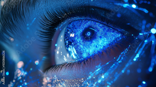 eye, blue, digital, technology, abstract, glowing, line, bokeh, closeup, macro, futuristic, science fiction, cyberspace, artificial intelligence, human, iris, pupil, eyelash, detail, pattern, texture, design, art, graphic, illustration, concept, vision, look, gaze