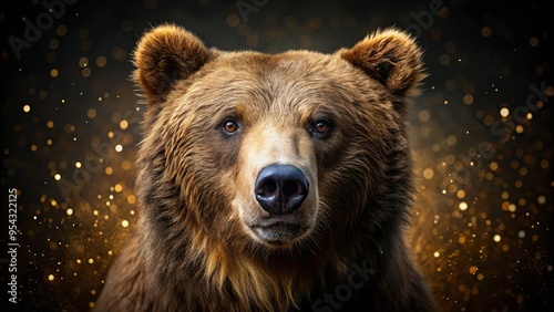 Close up of a brown bear's face on a black background with gold flecks in the foreground