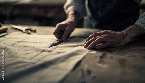 carpenter, craftsman, woodworker, hand, knife, fabric, cut, workshop, artisan, craft, thread, shape, spool, tape, seam, grain, constructed, kit, project, trade, trend, labor, blur, large, room, style, light, board, art