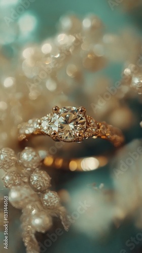 Close up of a diamond engagement ring nestled among pearls, soft teal background, shallow depth of field.
