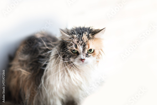 Close up of a Funny wet cat. Copyspace