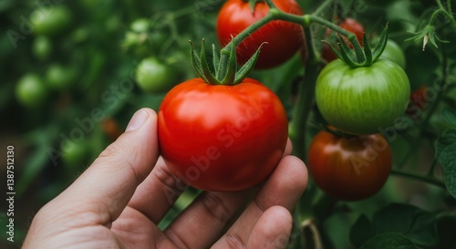 Close up of a hand picking a ripe red tomato from a vine in a garden. Fresh, homegrown produce concept.